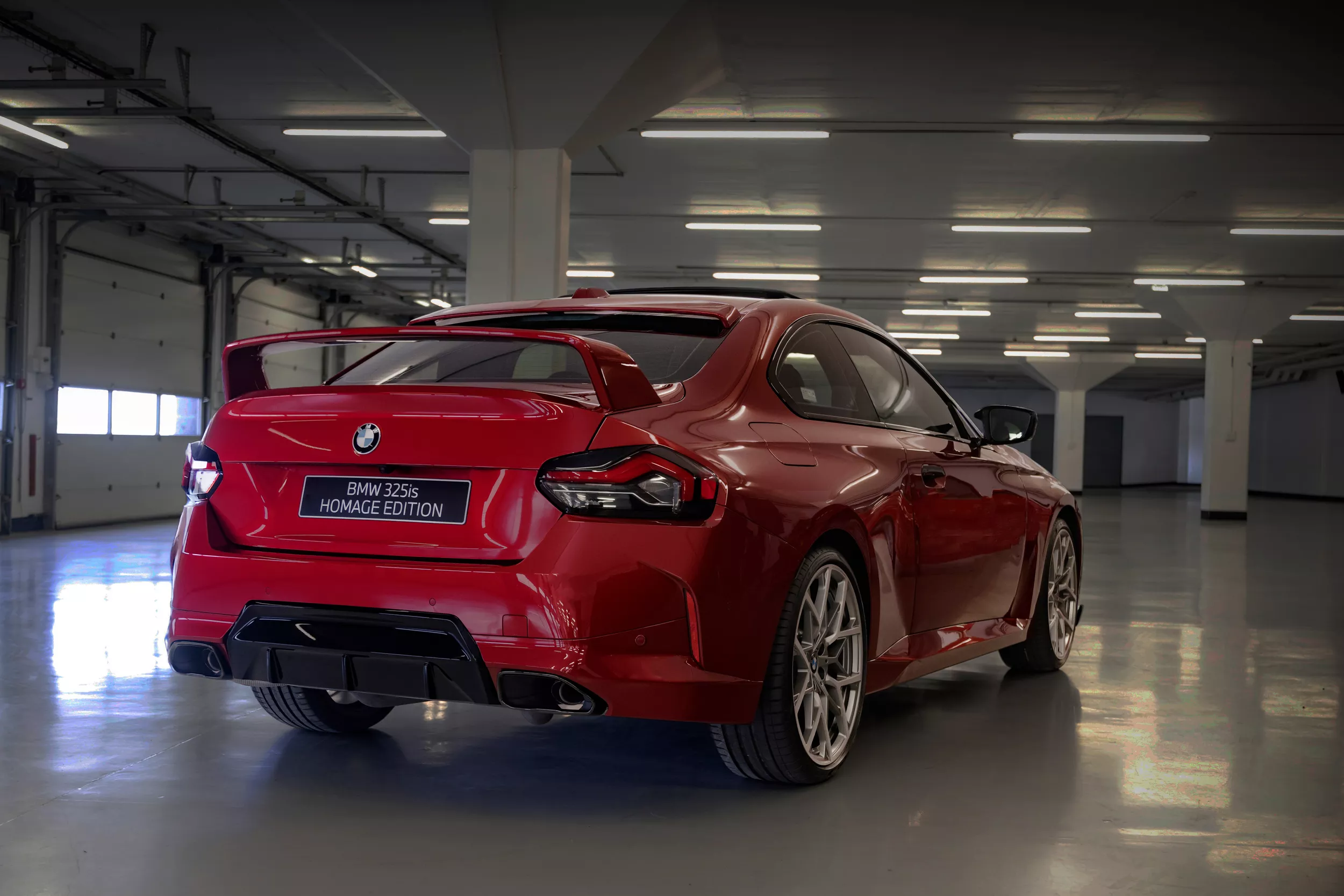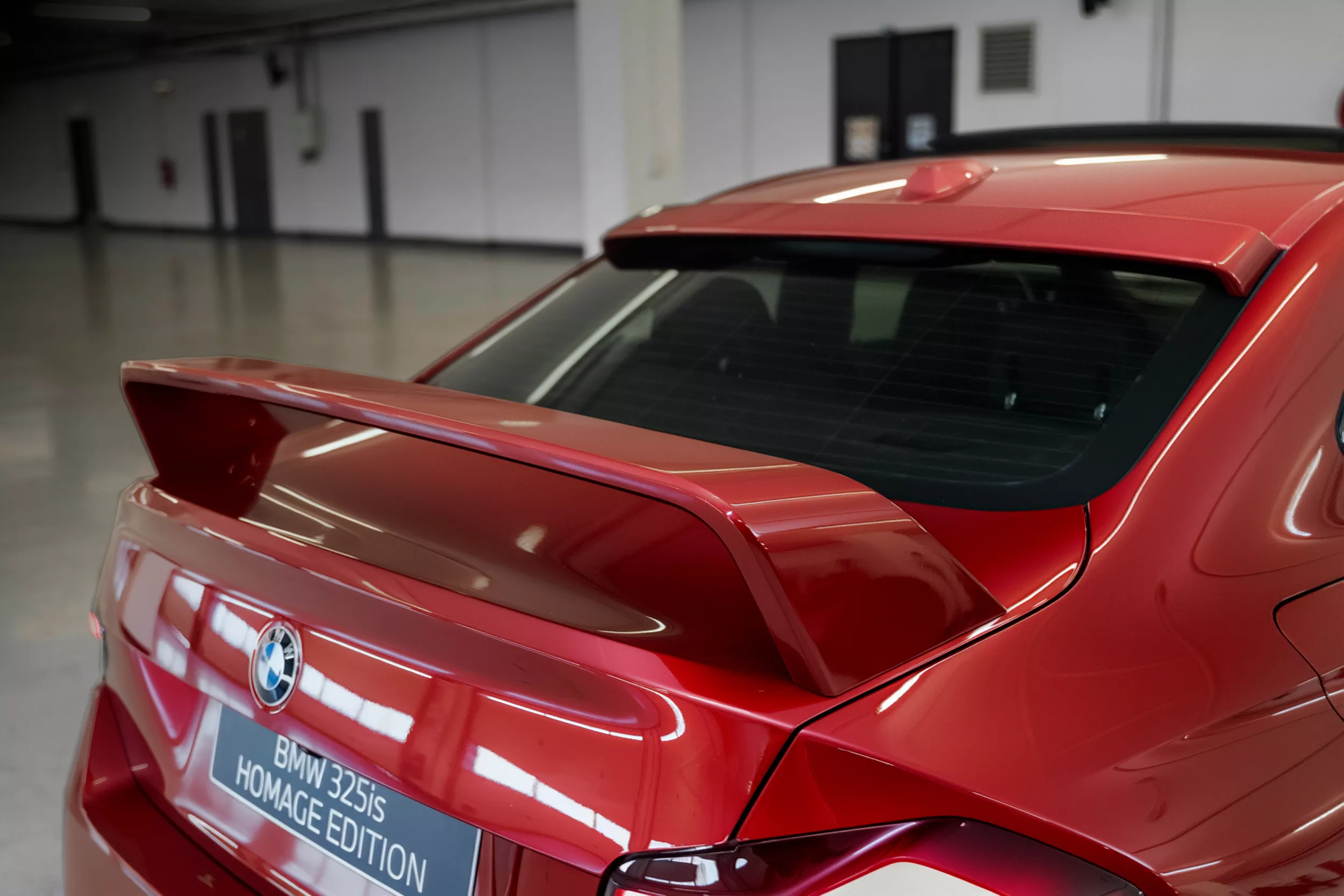يرتكز الإصدار 325iS Homage على طراز BMW M240i xDrive ويقدم مزيجًا متناغمًا بين الكلاسيكية والأداء العصري. من الخارج، تتميز السيارة بجناحين خلفيين مزدوجين يعززان الديناميكية الهوائية، مع عجلات M Performance مقاس 20 بوصة تحمل تصميمًا مستوحى من سيارات الثمانينات. كما تم تزويد السيارة بمقابض أبواب سوداء ولمسات تصميمية تحاكي أسلوب طراز E30 الأصلي، إضافة إلى نظام عادم رياضي من M Performance وحزمة M Sport Pro التي تمنحها مظهرًا هجوميًا راقيًا.